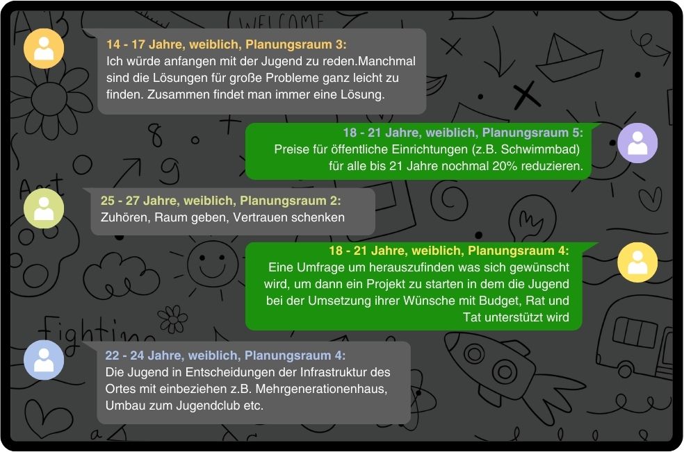 Auf die Frage, was die Befragten für die Jugend in ihrem Ort tun würden, wenn sie Bürgermeister*in wären, konnten wieder Freitextantworten gegeben werden, dazu folgend wieder eine Auswahl: